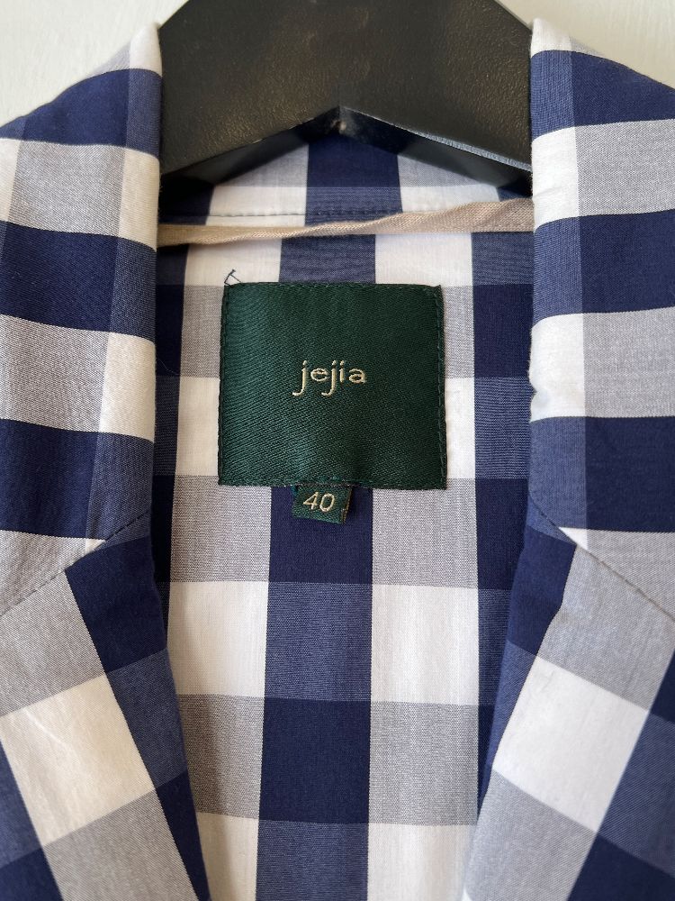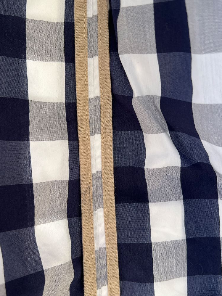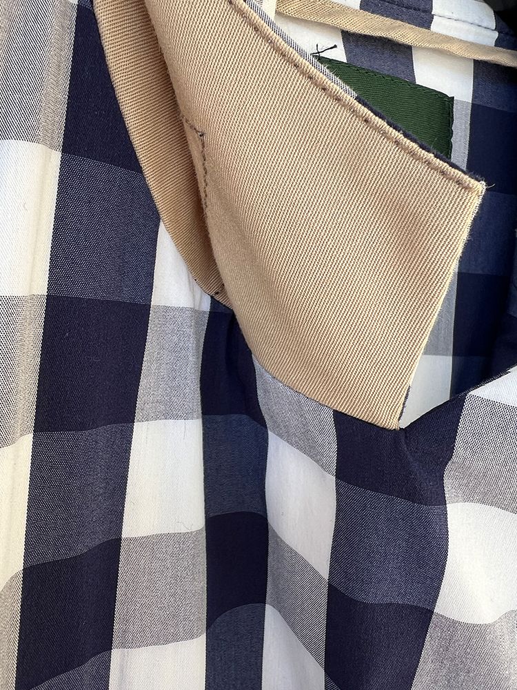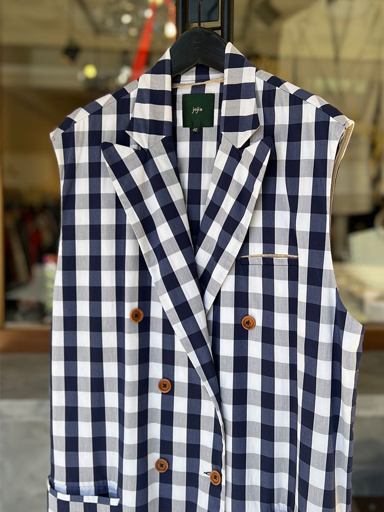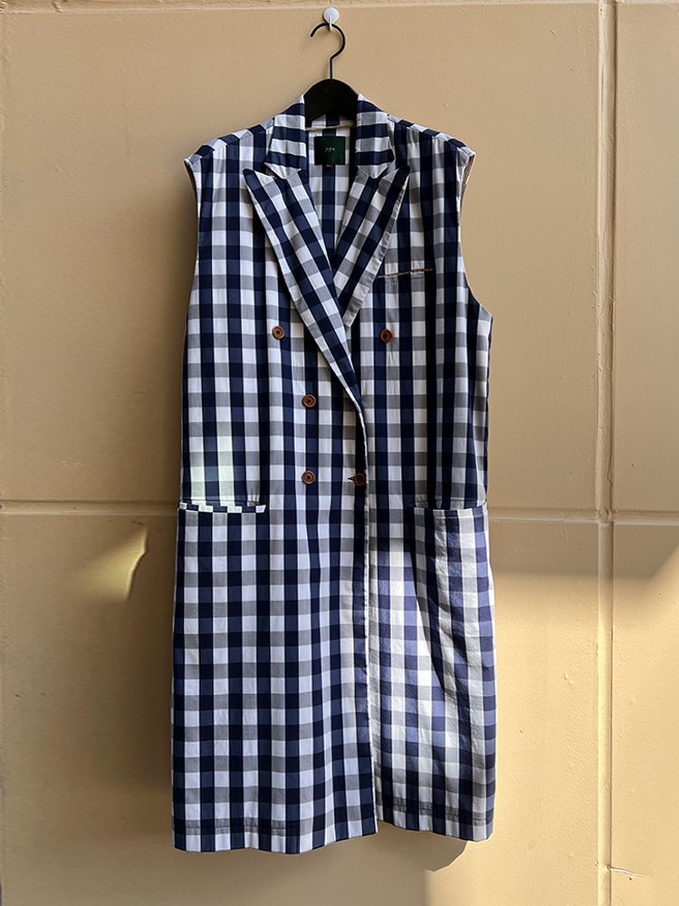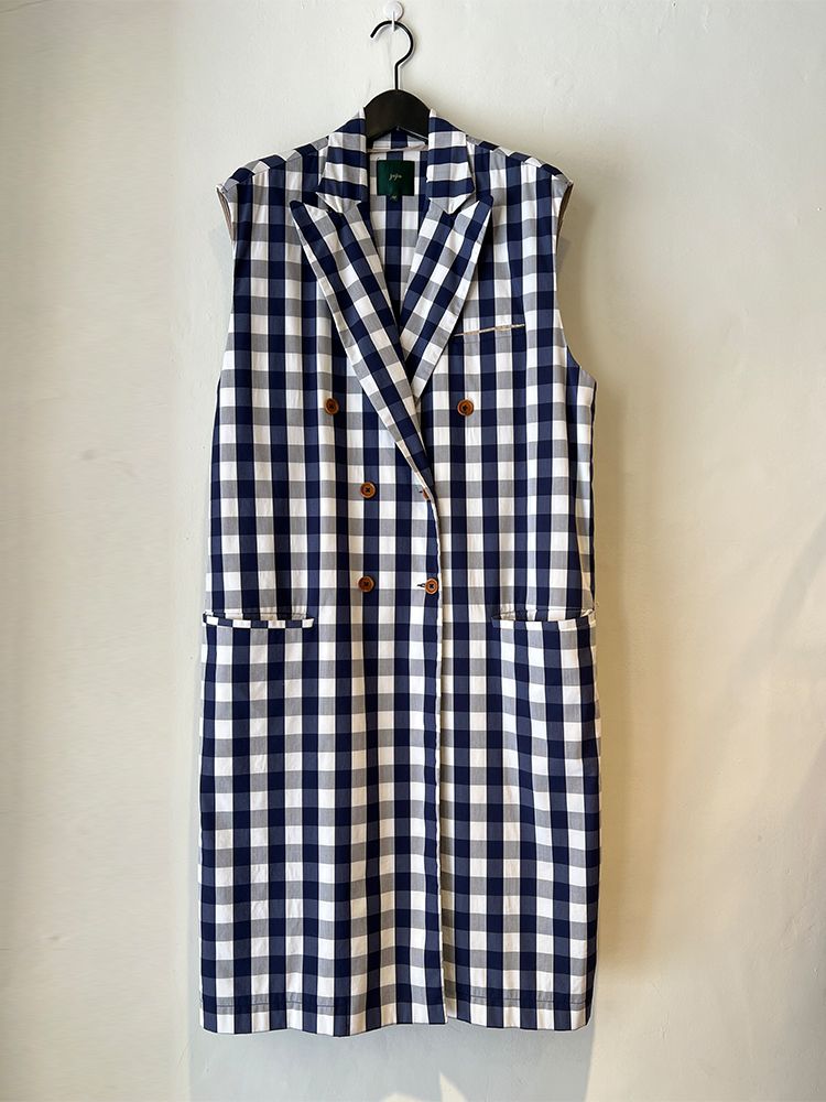 네이비 깅엄체크 패턴 소재로 트렌치코트 디테일의 롱기장 베스트로 크로징하여 벨트와 함께 드레스로도 연출.