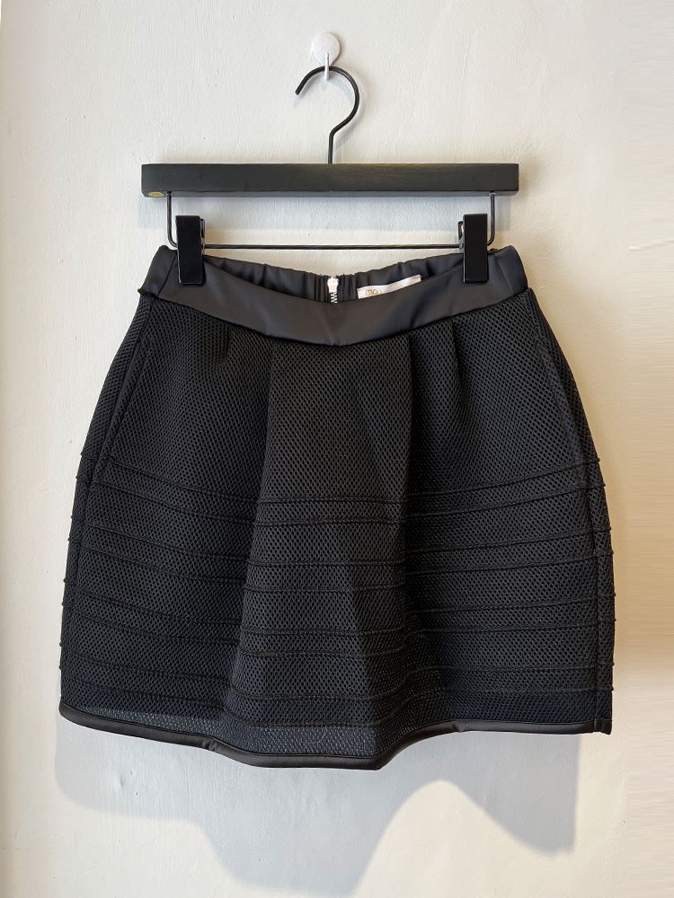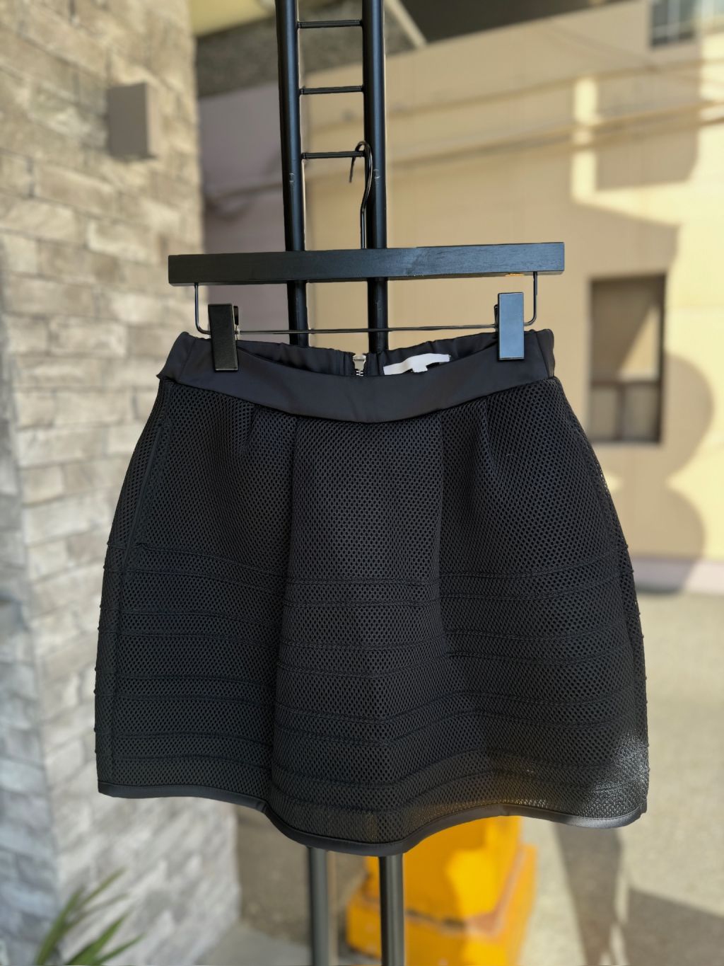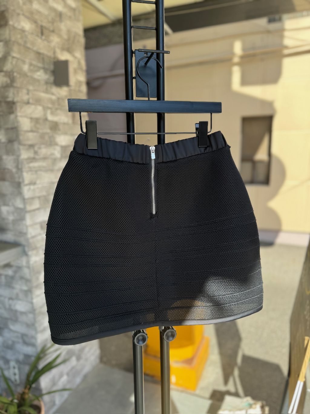 블랙 네오프렌 소재, 주머니,허리밴드처리,뒷 지퍼로 클로징하는 짧은 기장의 미니스커트