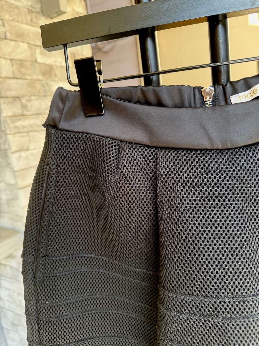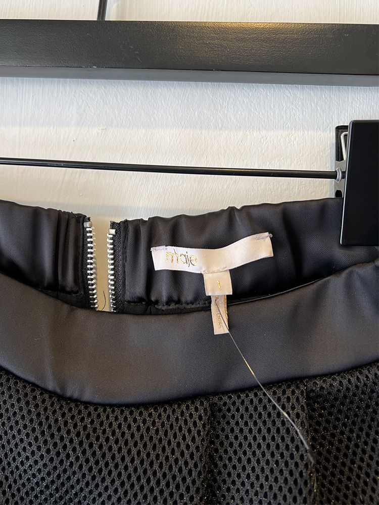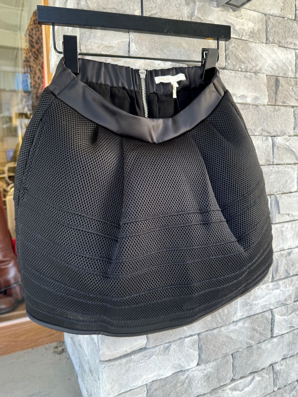 블랙 네오프렌 소재, 주머니,허리밴드처리,뒷 지퍼로 클로징하는 짧은 기장의 미니스커트