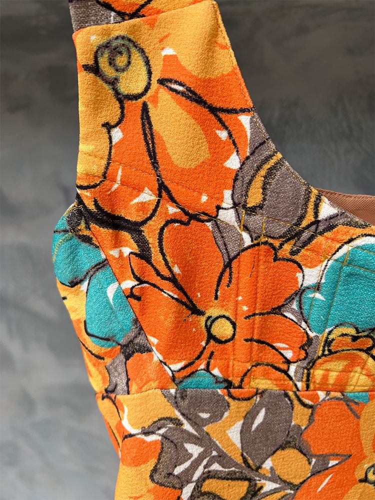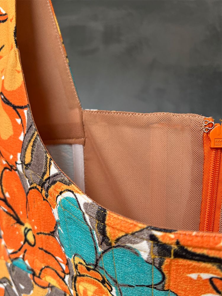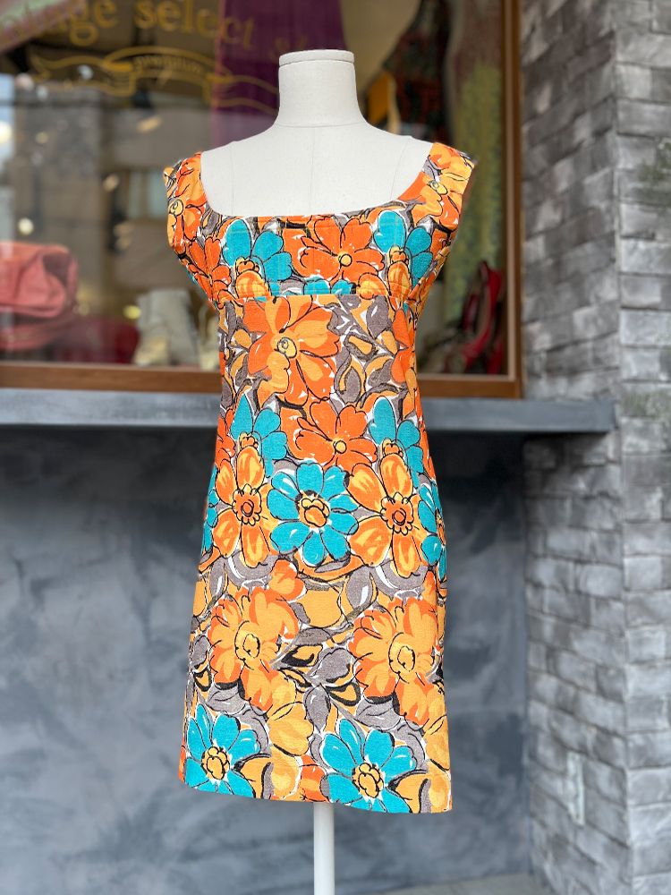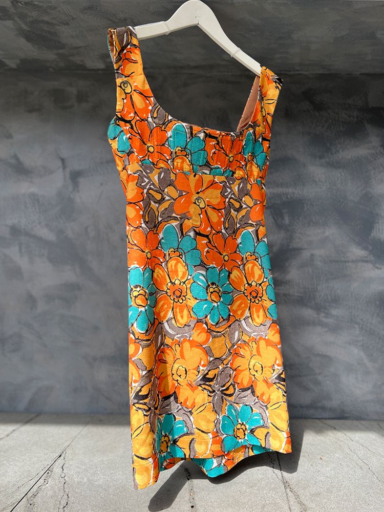 오렌지, 플라워프린트, 스퀘어넥 바스트라인, 뒷 지퍼로 클로징 미니드레스