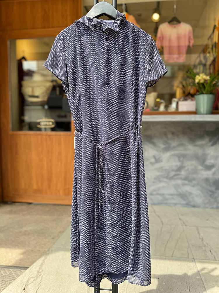네이비, 레트로풍의 도트 프린트, 네크라인 러플장식, 랩디자인의 미디 드레스