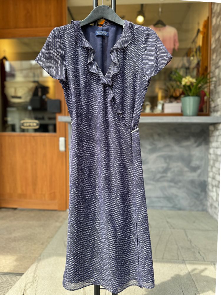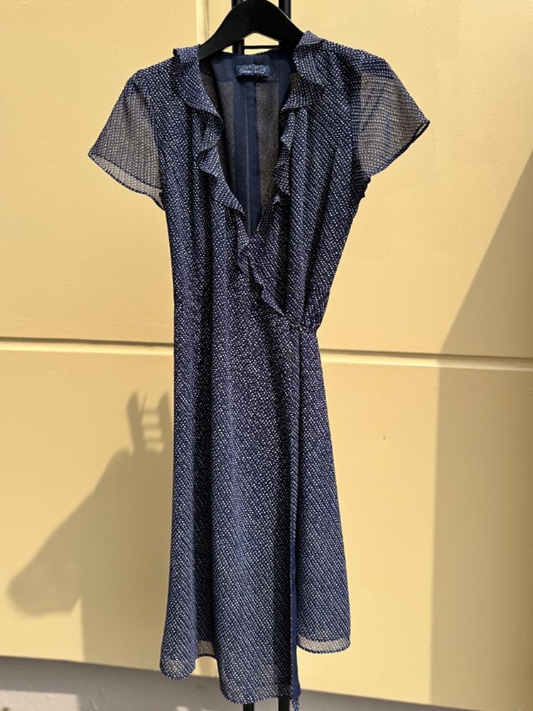 앤 테일러 네이비 도트 프린트 러플 랩 드레스