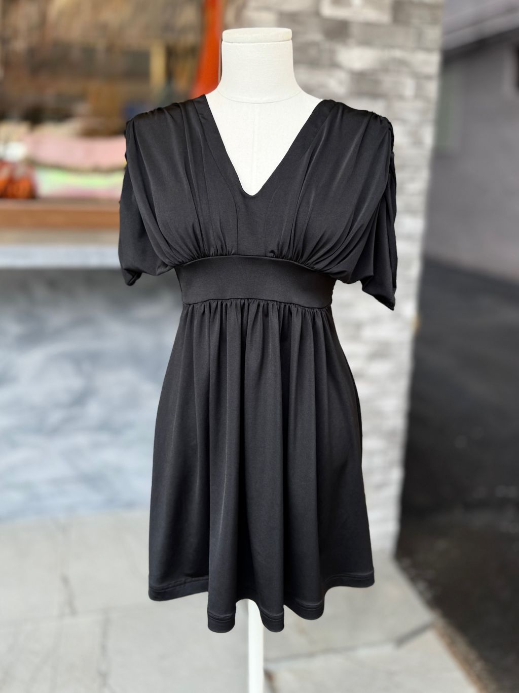 블랙, 깊은 브이넥 파임, 기모노 디자인의 짧은기장 드레스