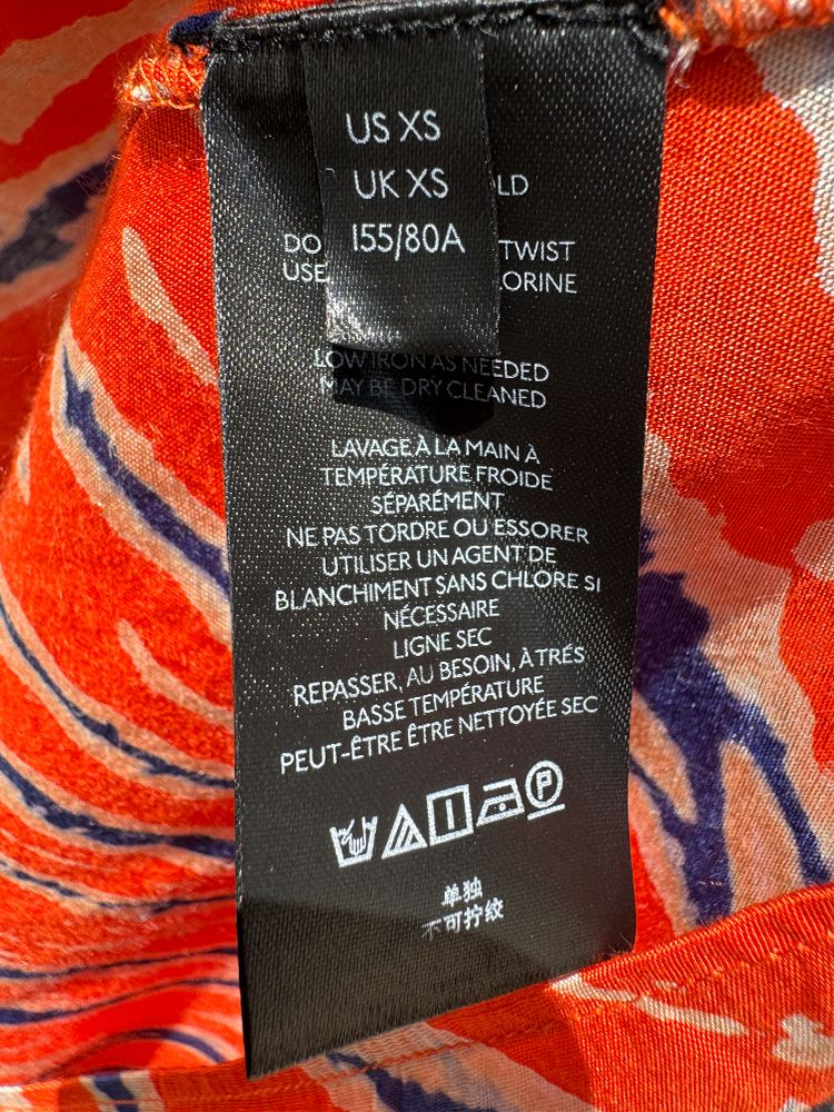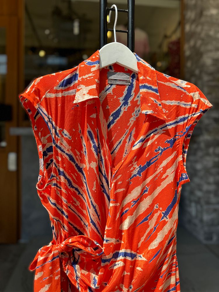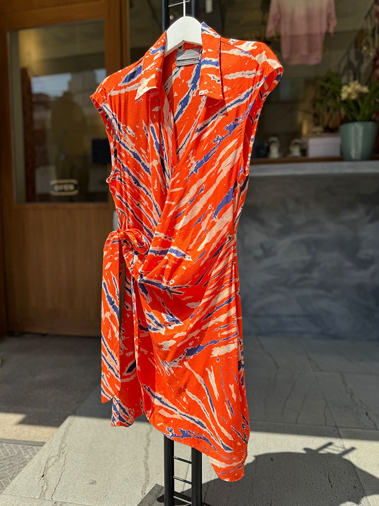 오렌지,프린트 원단, 랩 스타일로 묶어서 클로징, 미니기장의 드레스