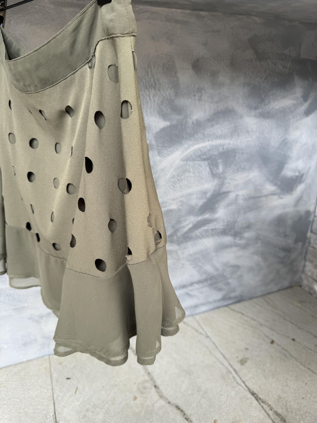 카키, 도트 펀칭 디자인 원단, 플레어 미니 스커트