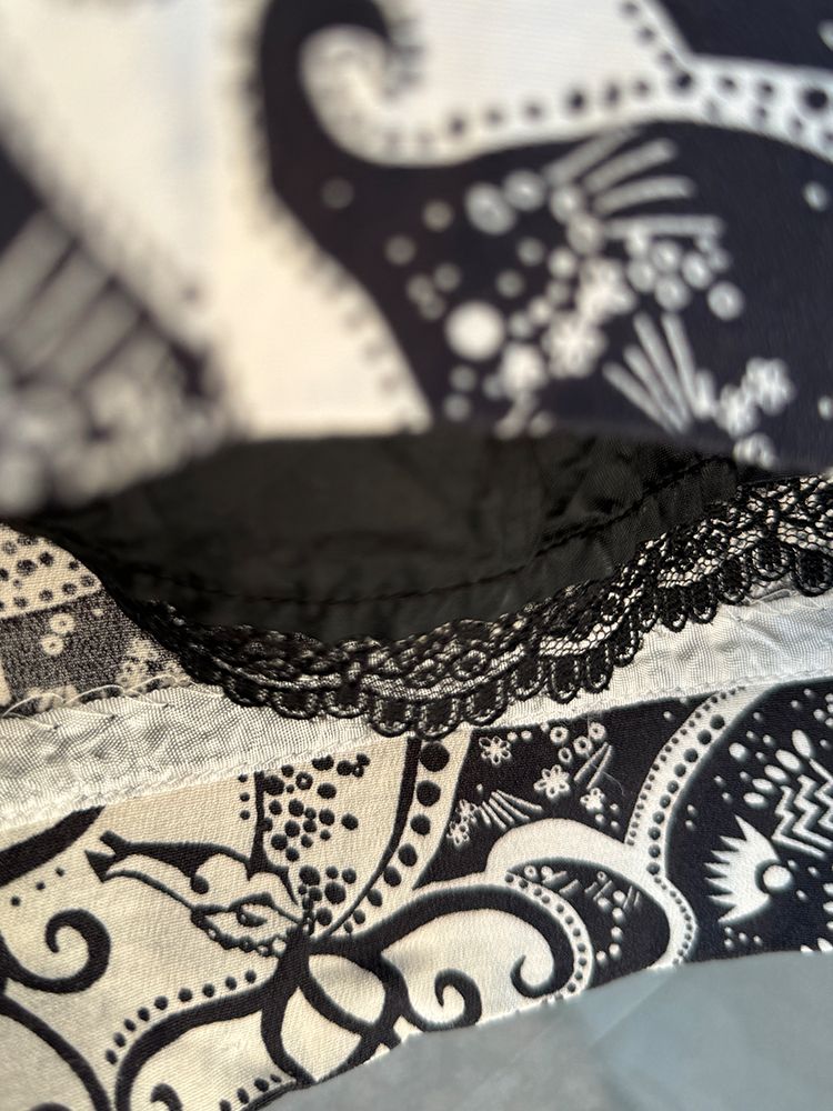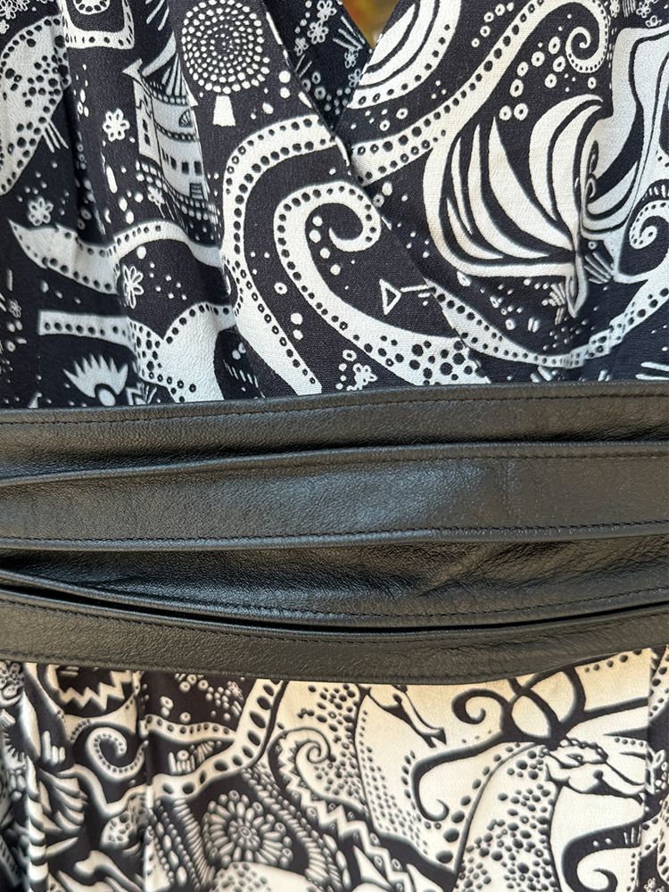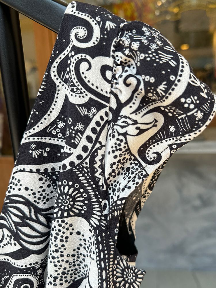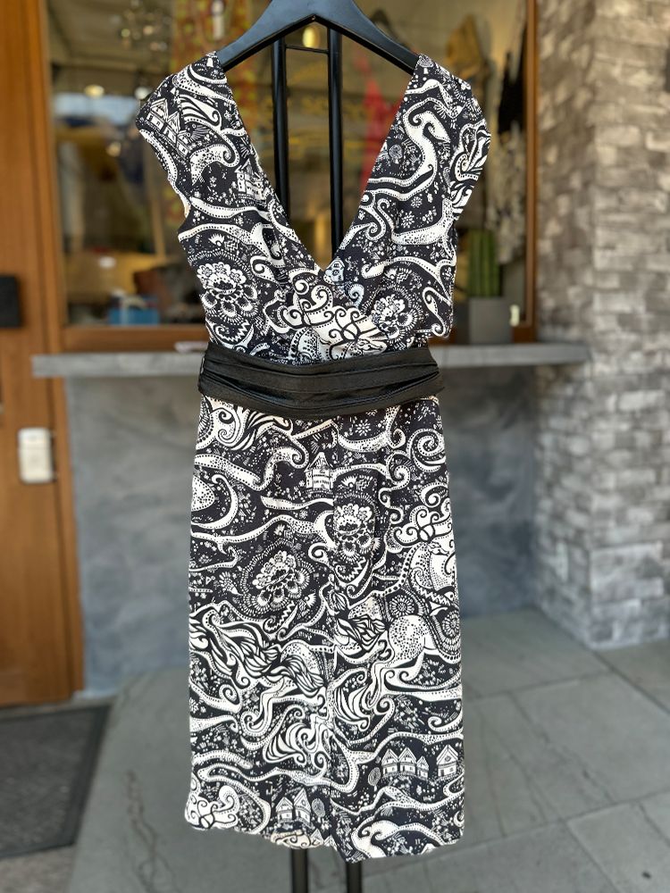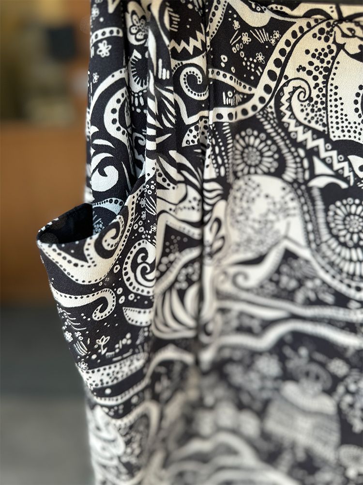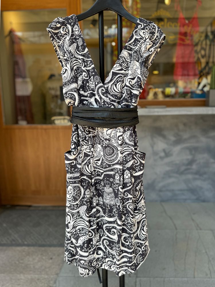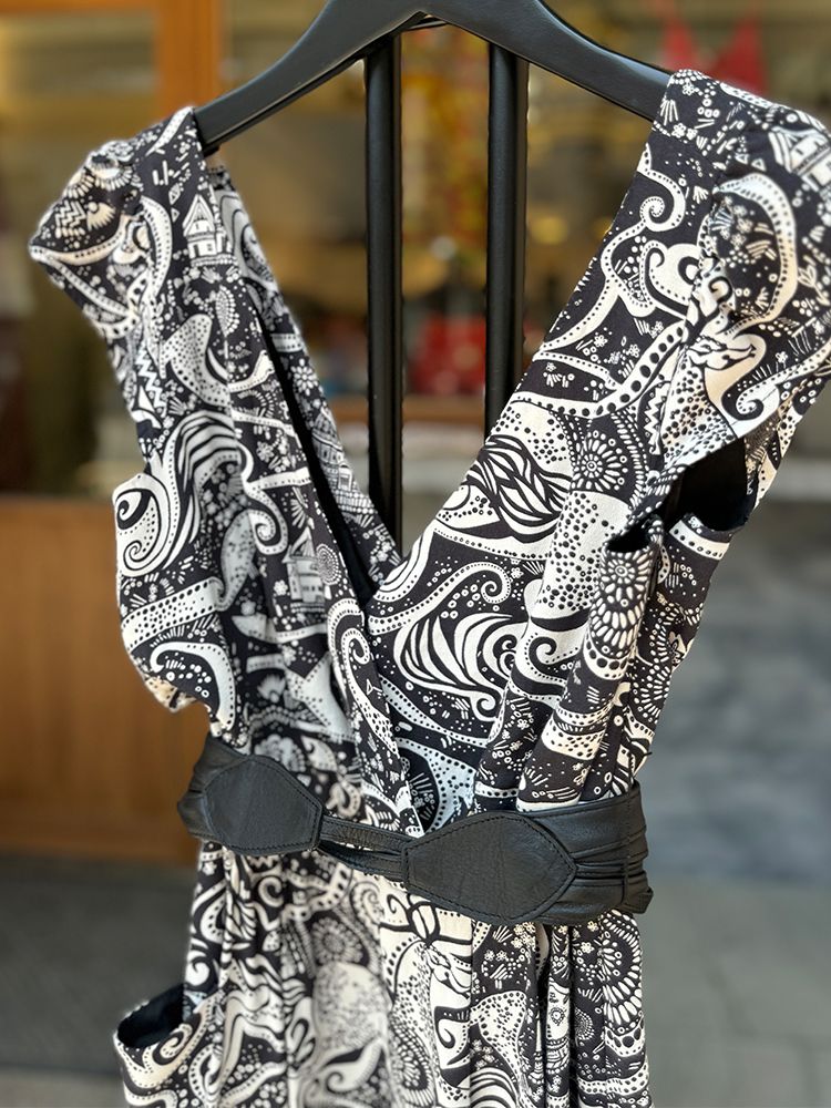 블랙 유니크한 기하학 프린트, 가볍고 시원한 레이온소재, 안감있음. 타이형 밸트 셋업, 주머니, 미디기장 드레스