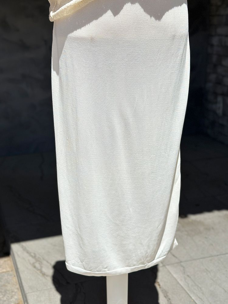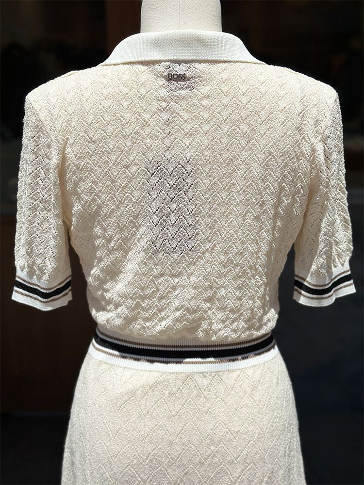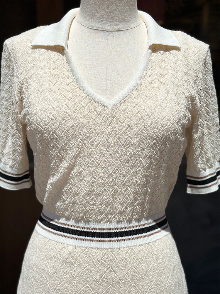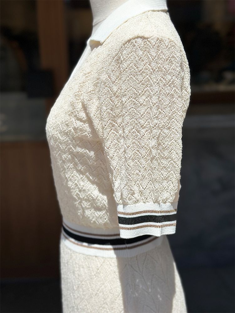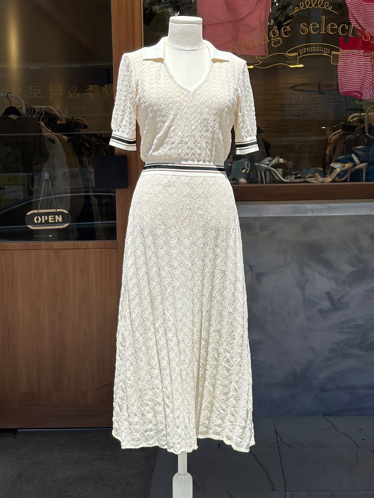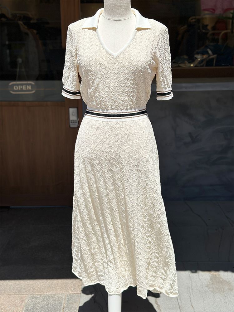 아이보리, 펀칭 니트 짜임, 깊은 넥파임과 카라, 소매 밑단과 허리 포인트 시보리 밴딩,숏 슬리브, 안감있음, A라인 맥시드레스