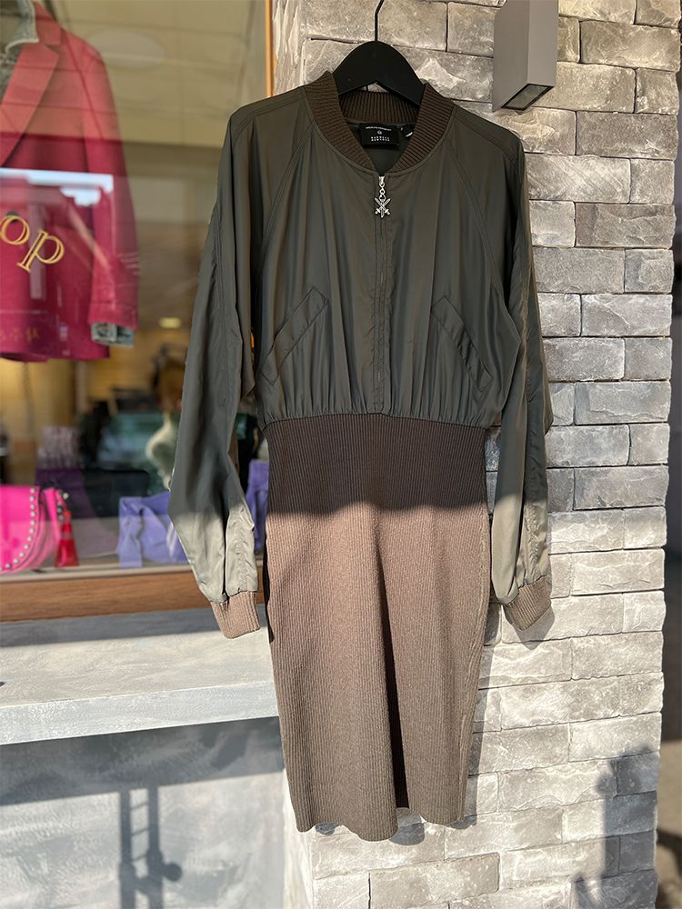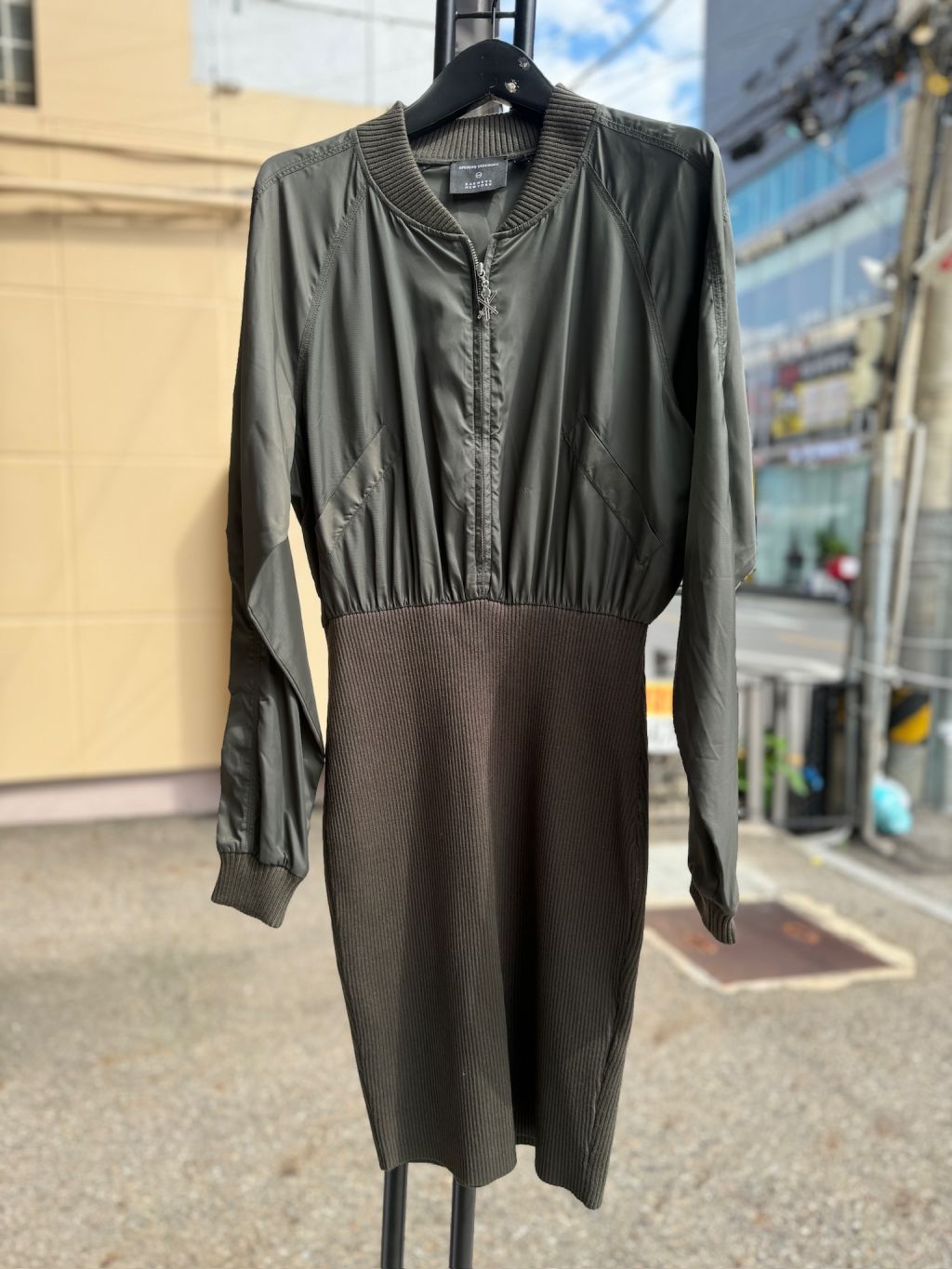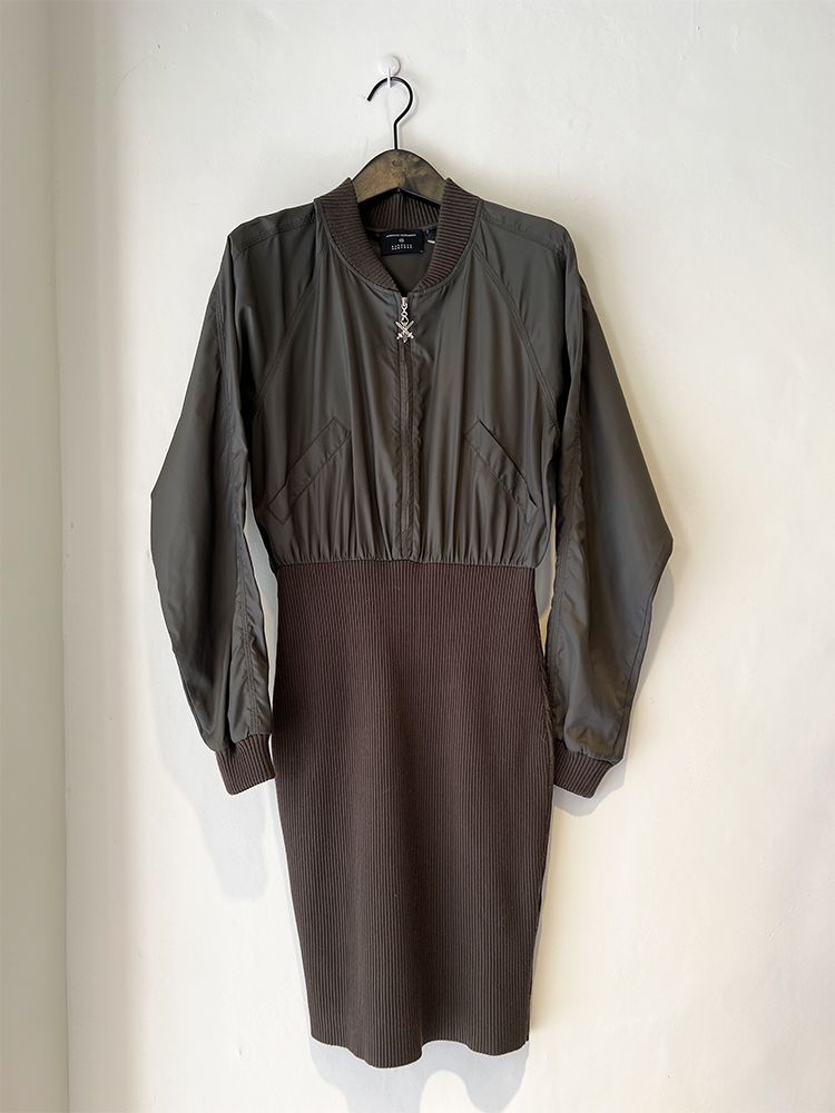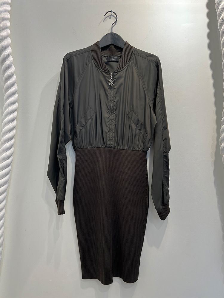 카키,우븐과 니트소재 콤비, 블루종 디자인의 상의로 지퍼로 글로징 양쪽 주머니와 소매 카라 시보리 처리된 드레스
