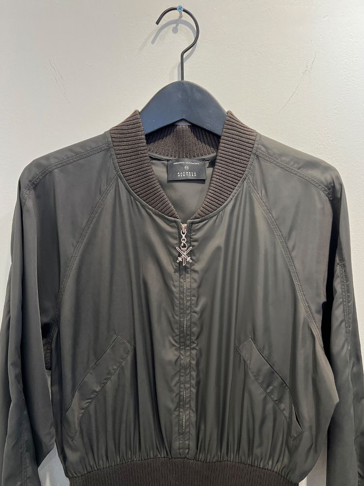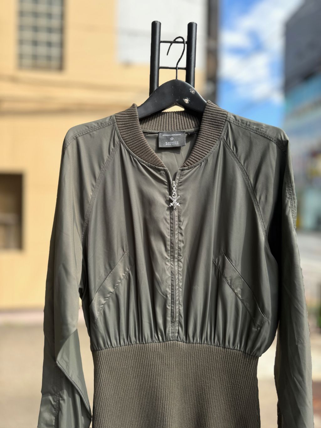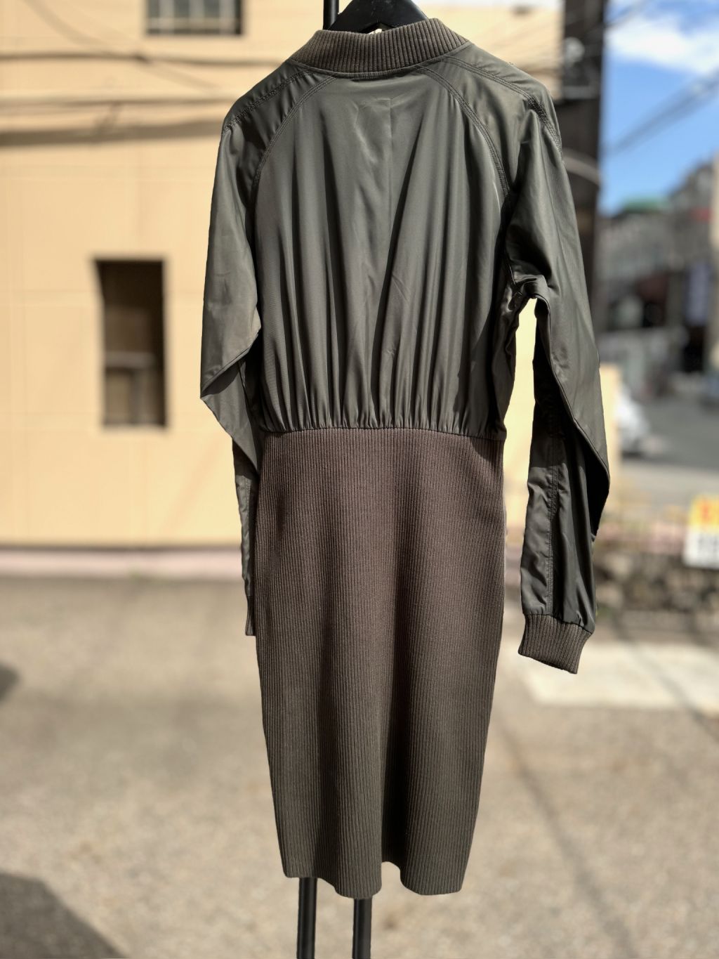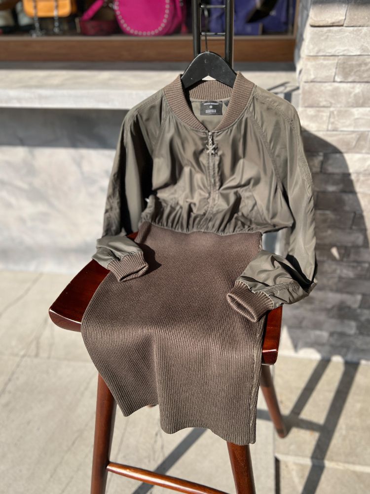 카키,우븐과 니트소재 콤비, 블루종 디자인의 상의로 지퍼로 글로징 양쪽 주머니와 소매 카라 시보리 처리된 드레스