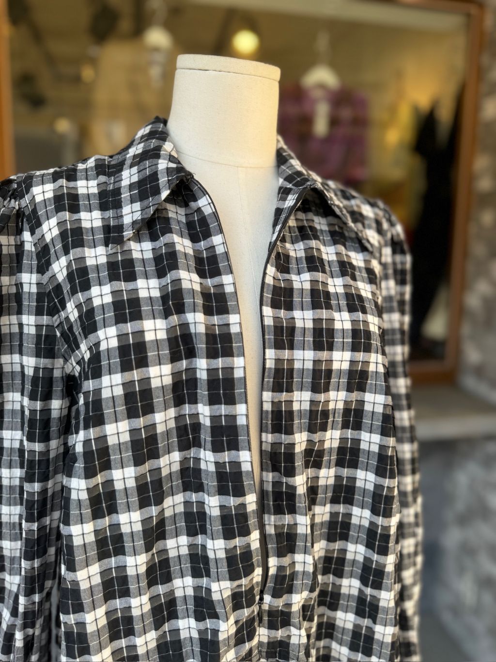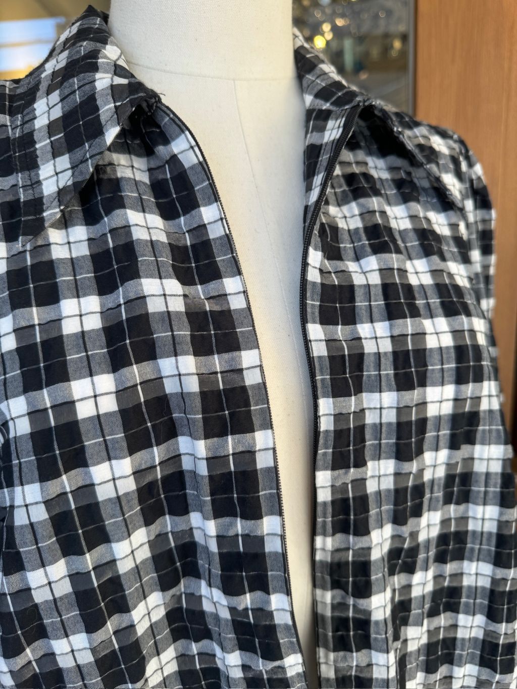 - 상의 전면에 지퍼가 있는 긴 소매 기장의 디자인입니다.
