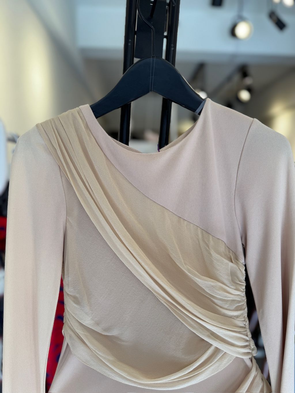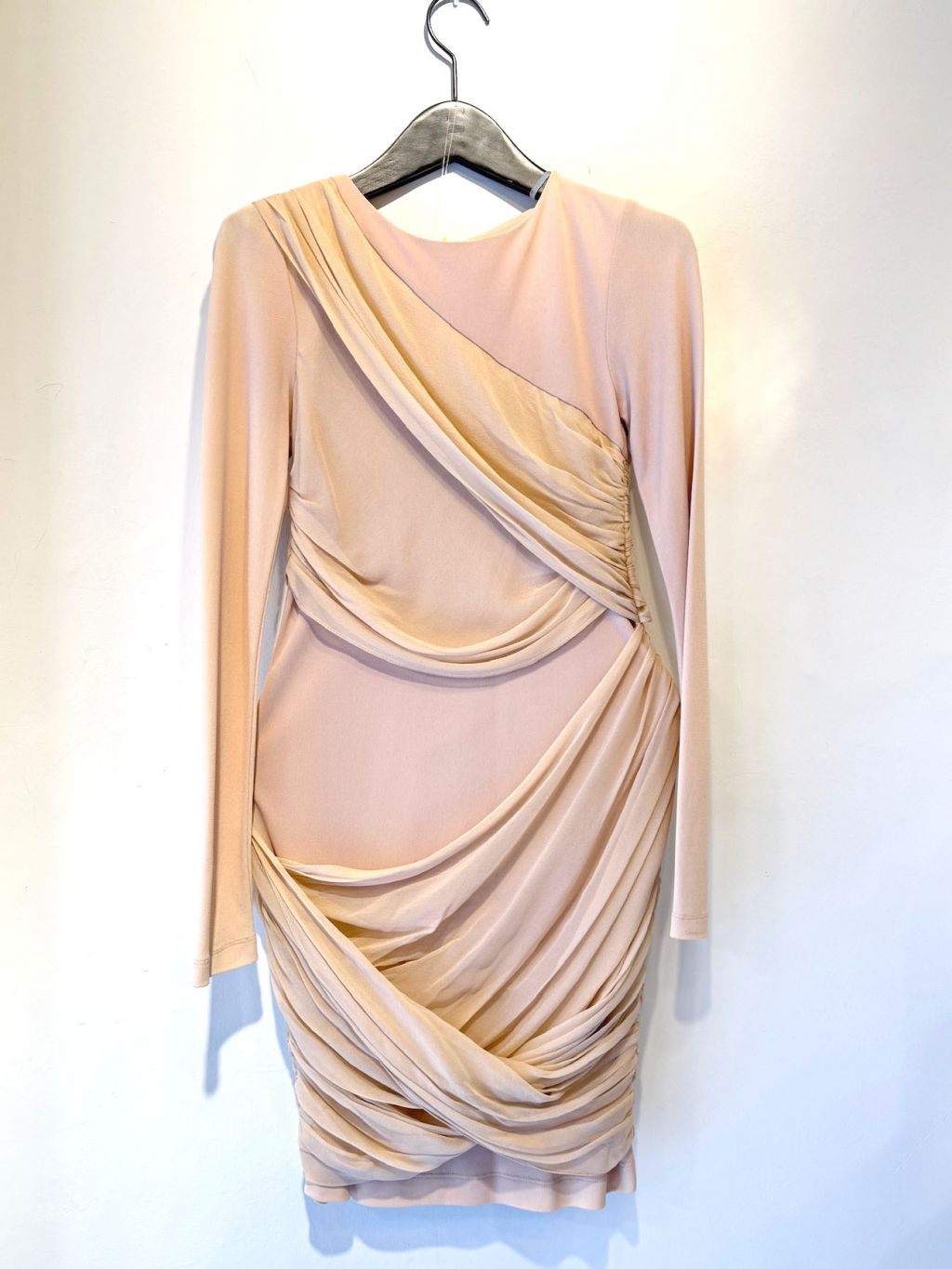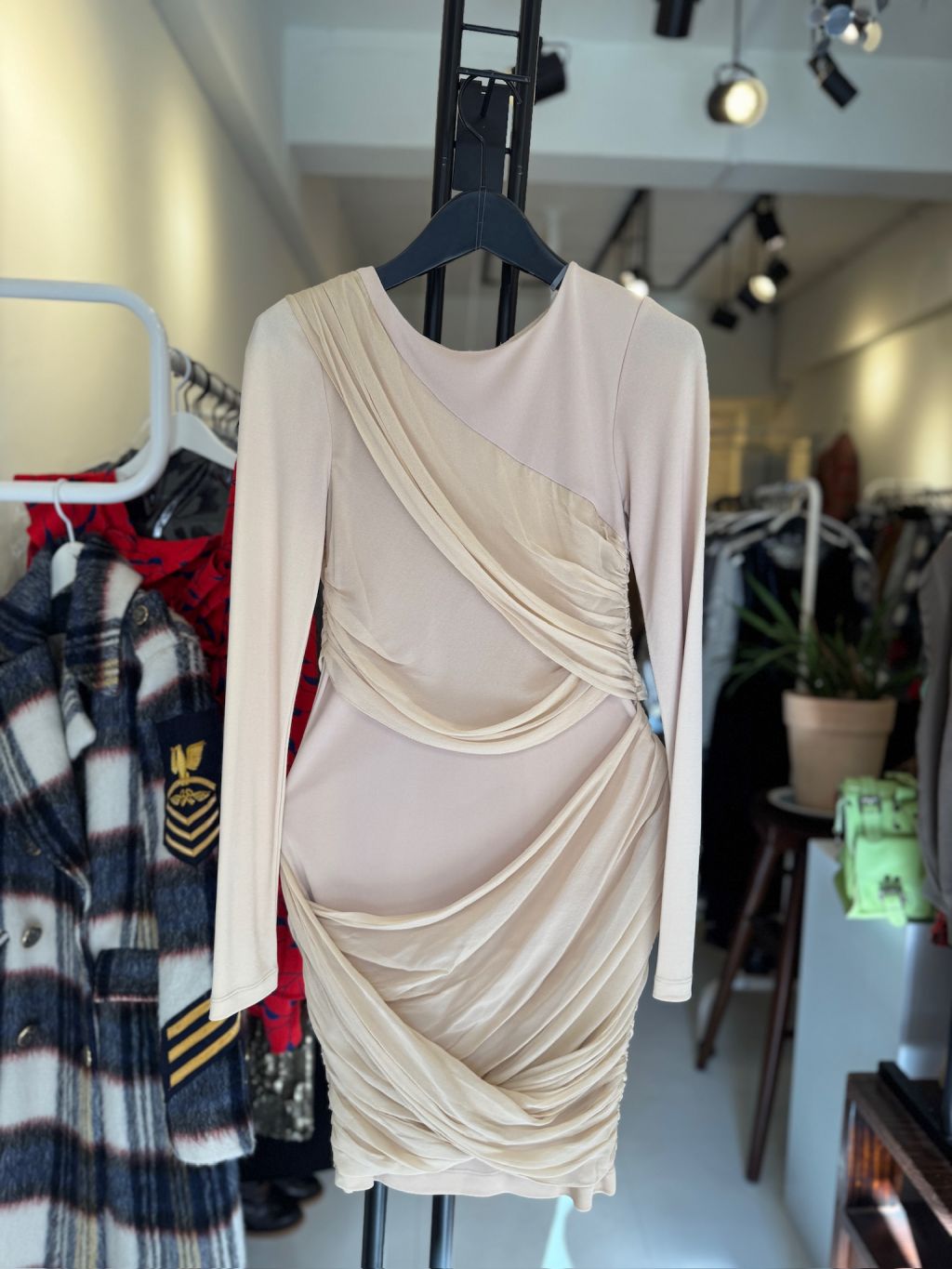 - 슬림핏 드레이핑 미니 드레스 디자인입니다.