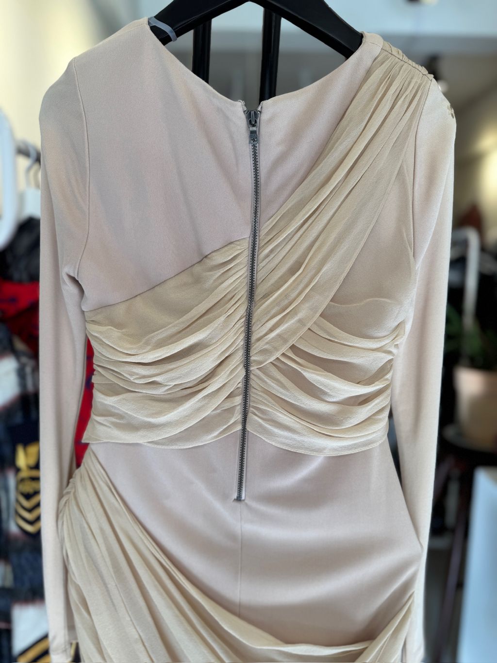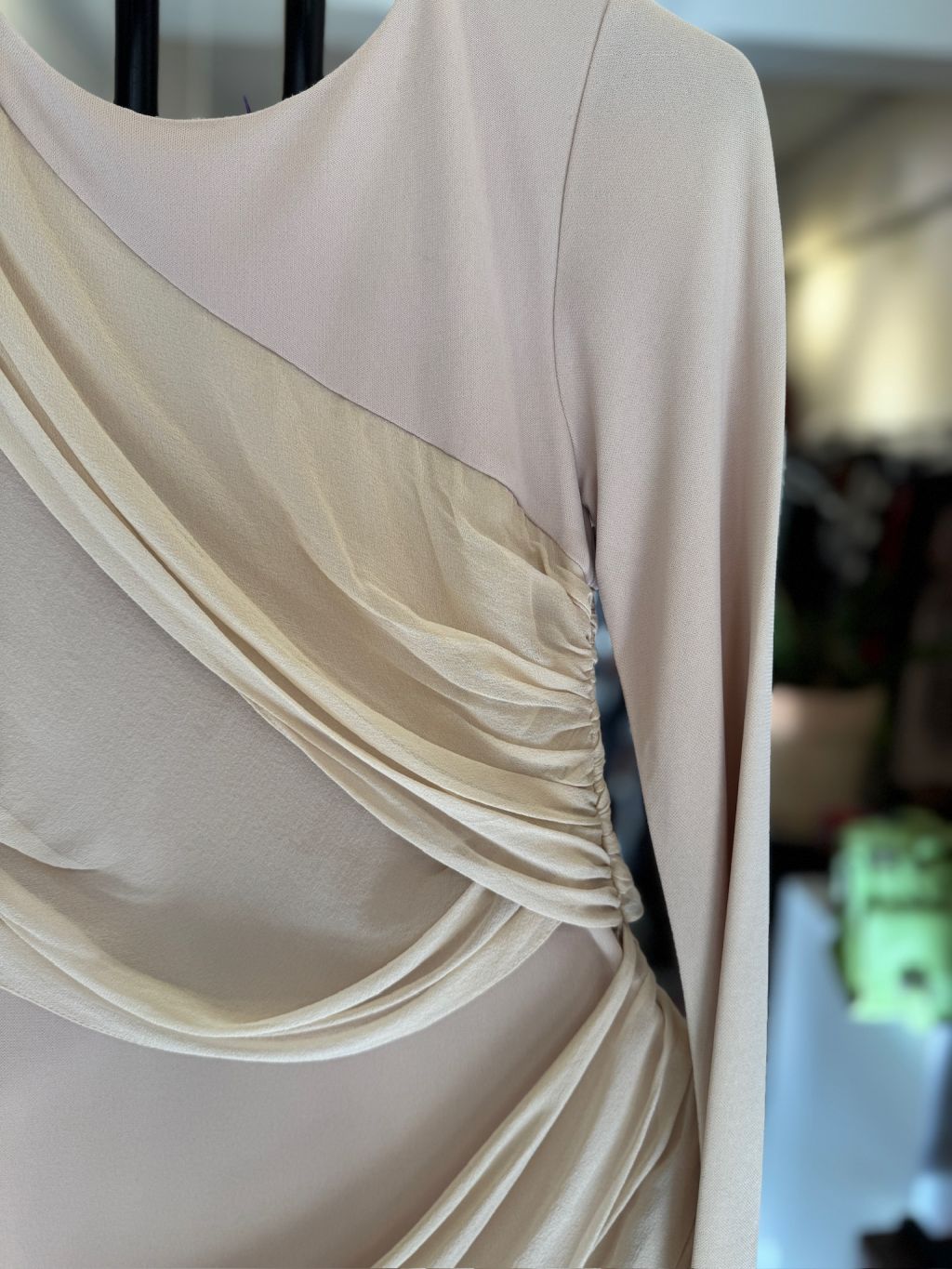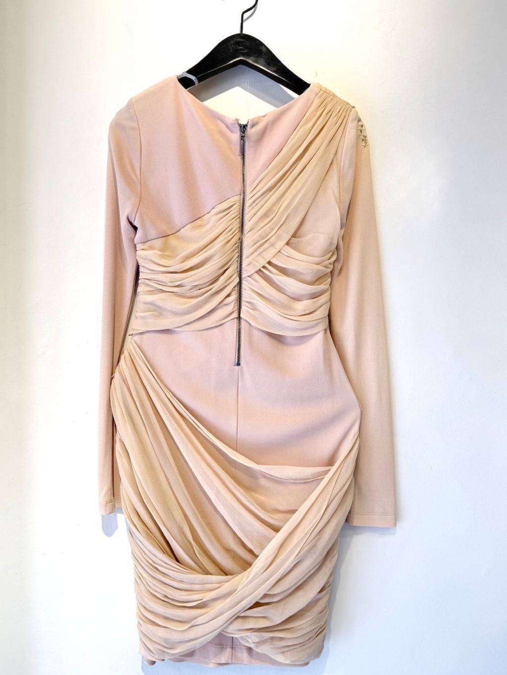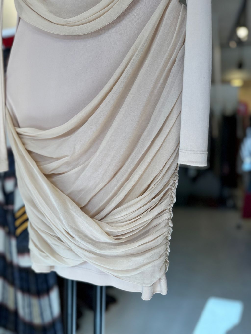 - 슬림핏 드레이핑 미니 드레스 디자인입니다.