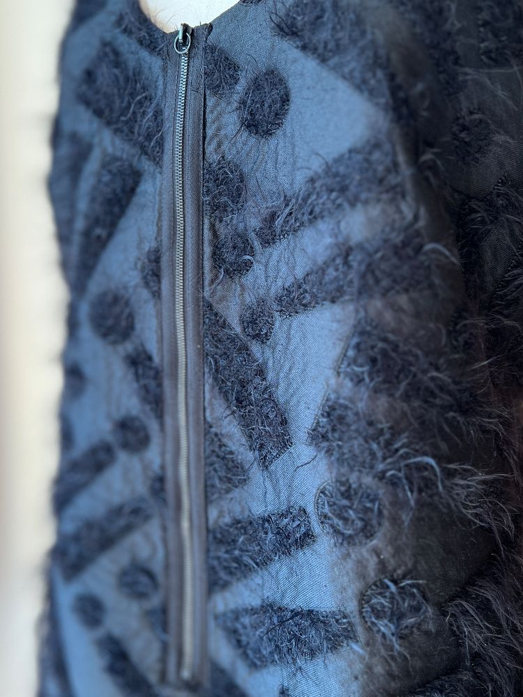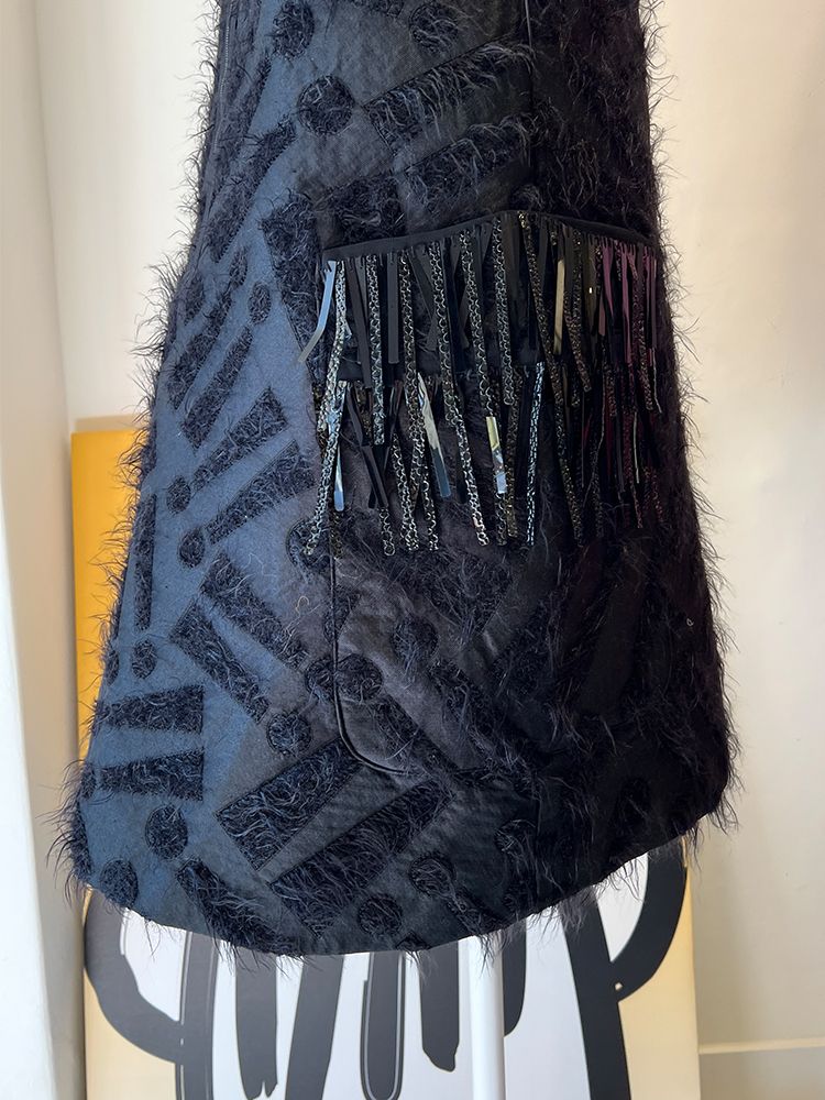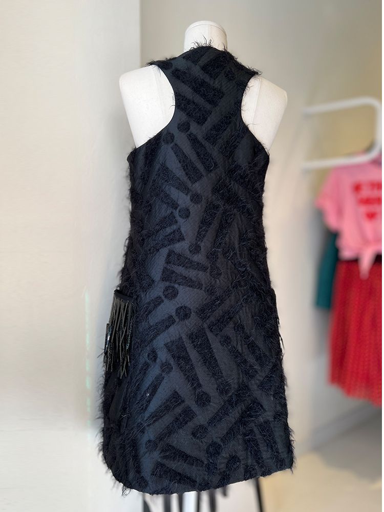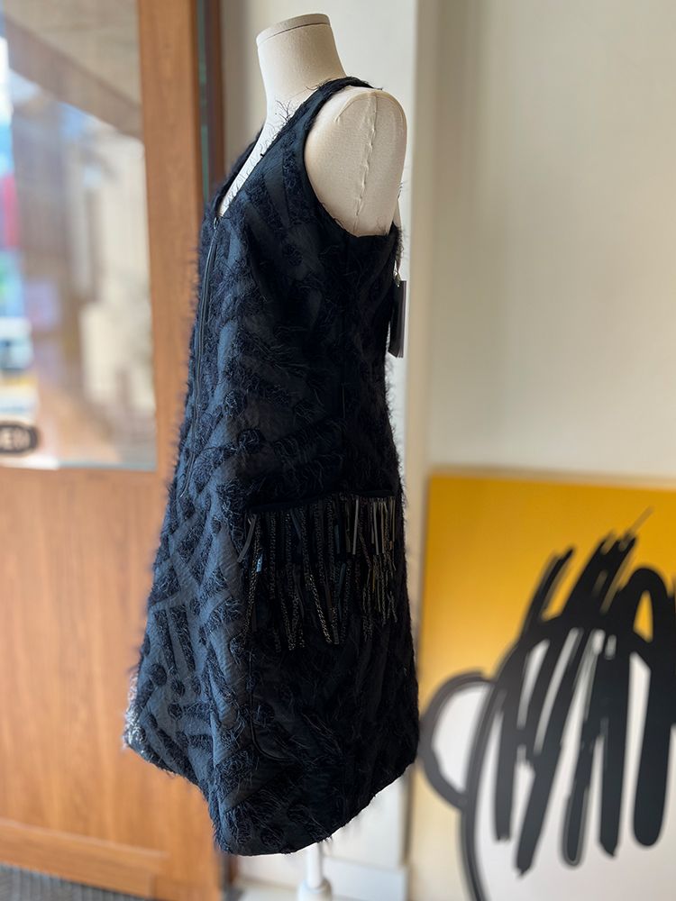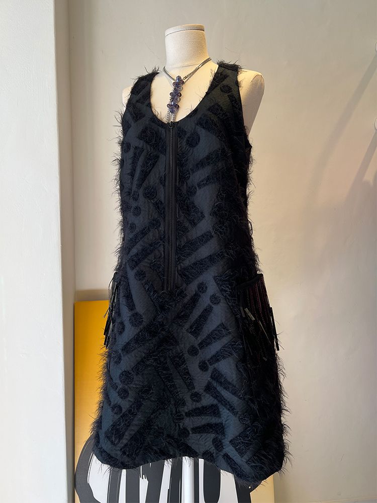 블랙,독특한 자가드 원단, 프론트 집업, 양쪽 주머니와 태슬장식 디테일, 소매가 없는 슬리브리스 드레스