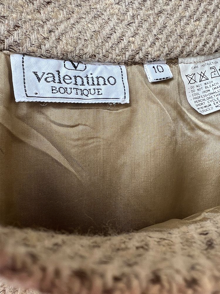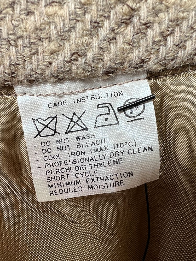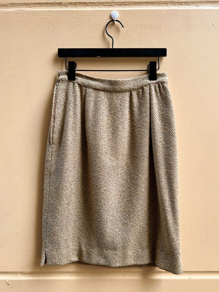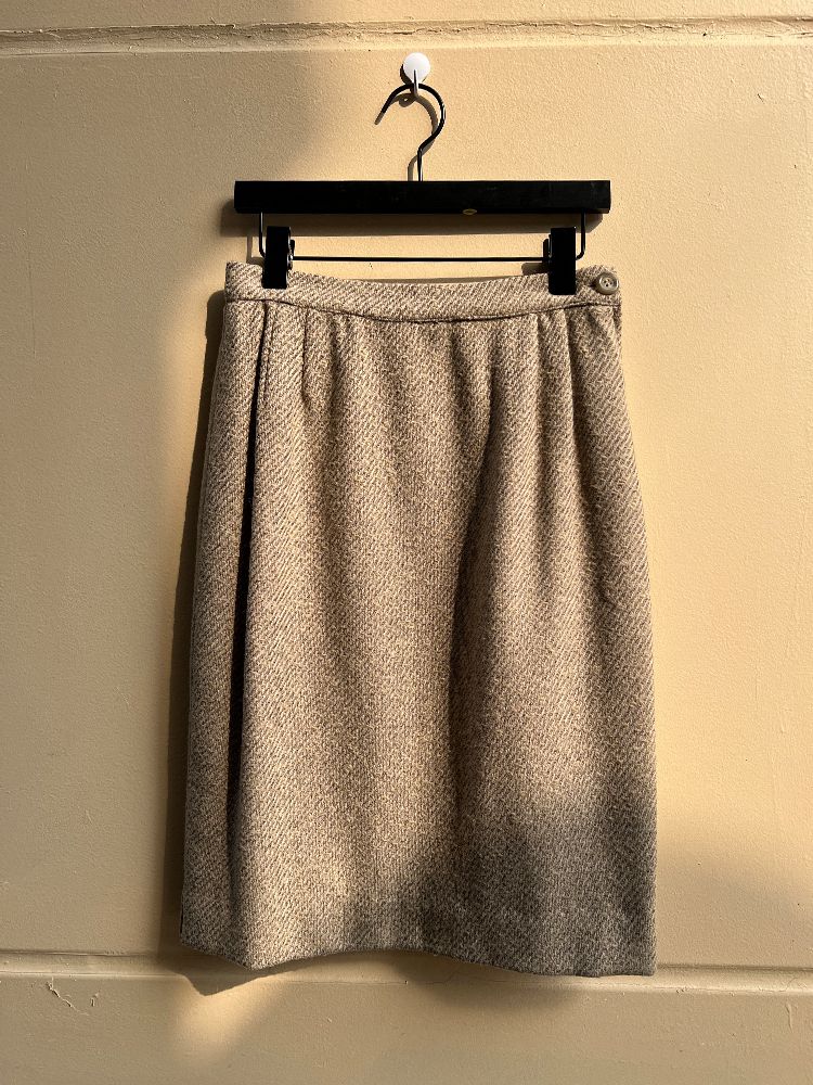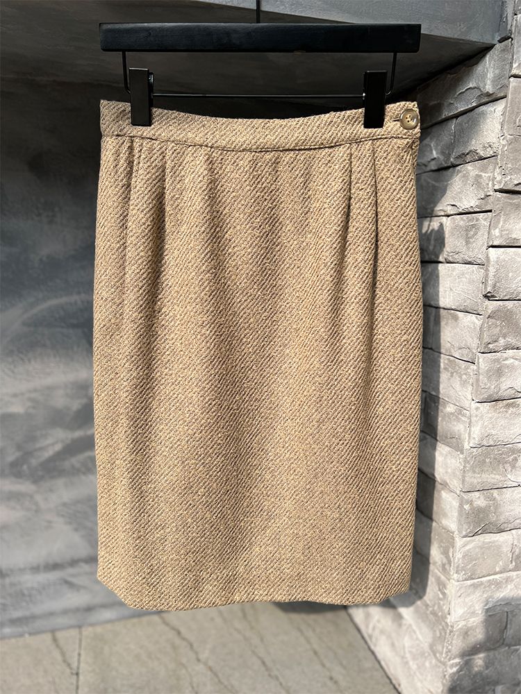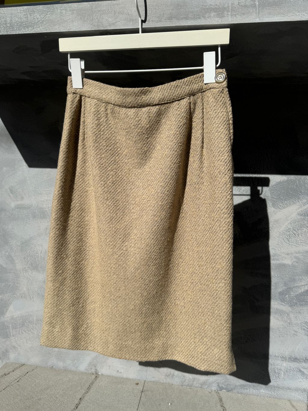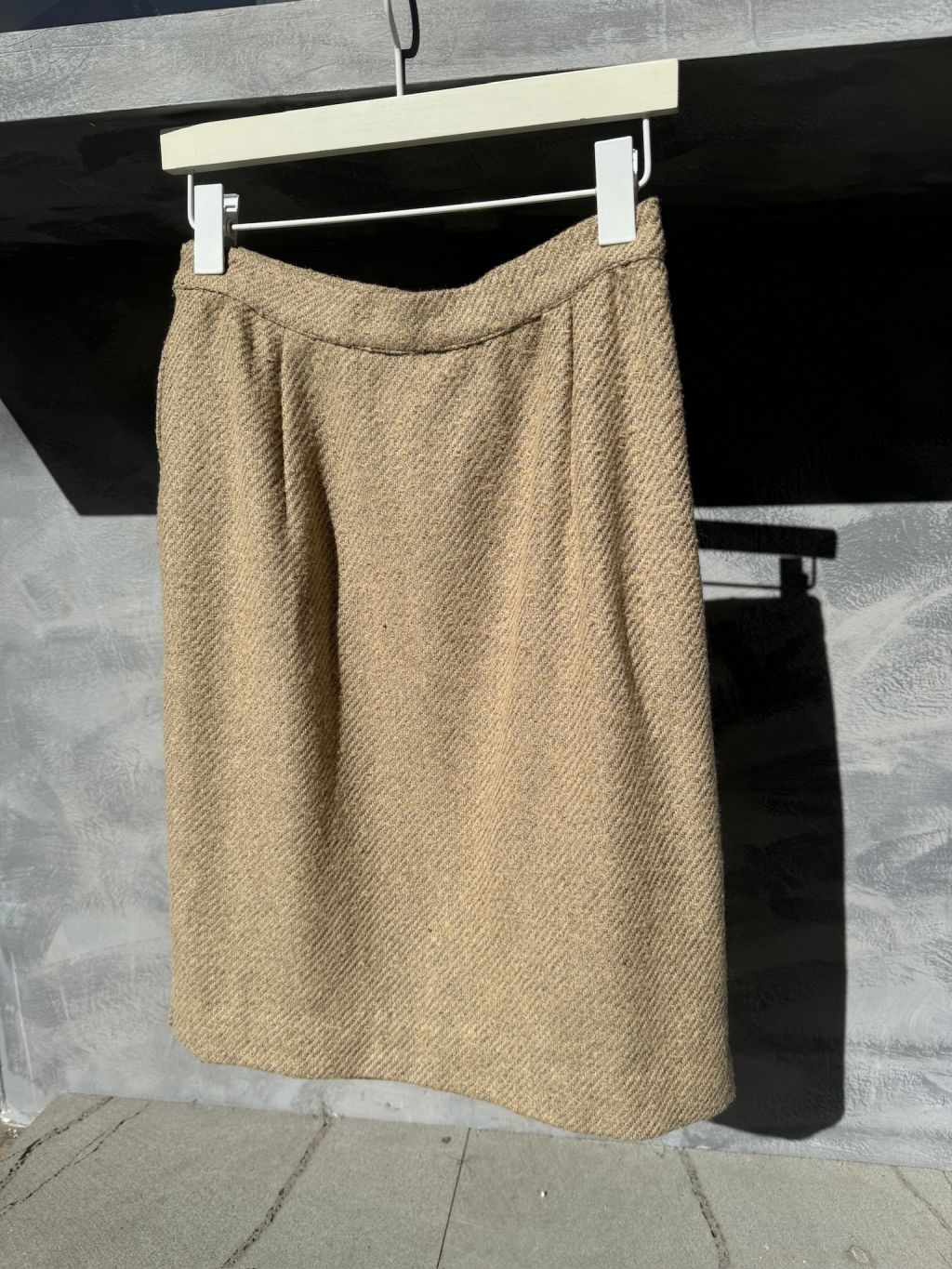 베이지, 울모직 소재의 미디기장 스커트 옆 지퍼와 단추로 클로징