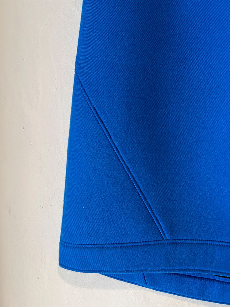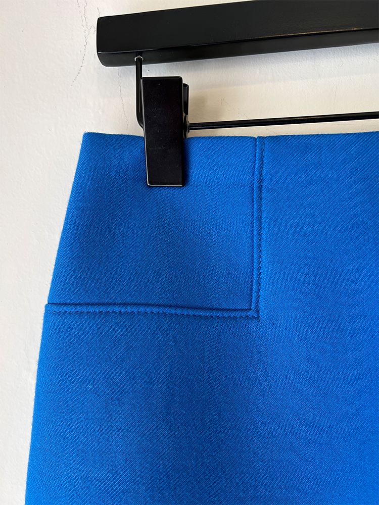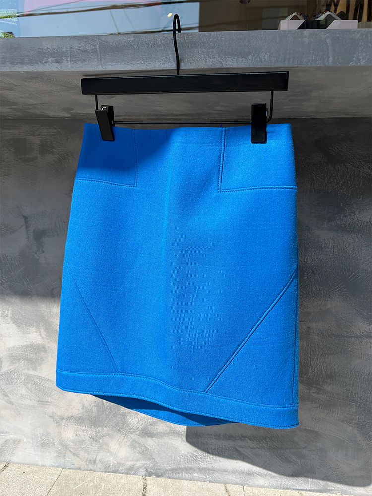 블루, 네오플랜 소재의 슬림한 스탠다드핏, 윗 지퍼로 클로징, 앞 뒤 언발란스 미니 기장의 스커트